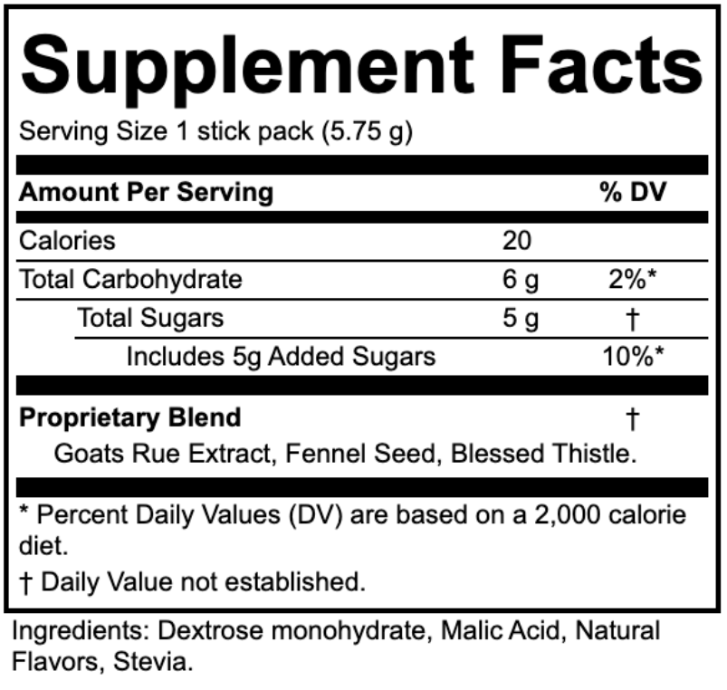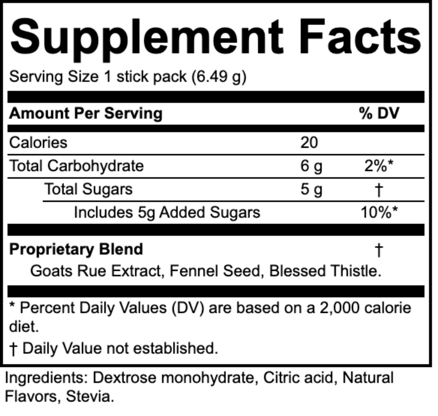 Nurtional Facts Supplement facts label with serving size, calories, carbohydrates, and ingredients.